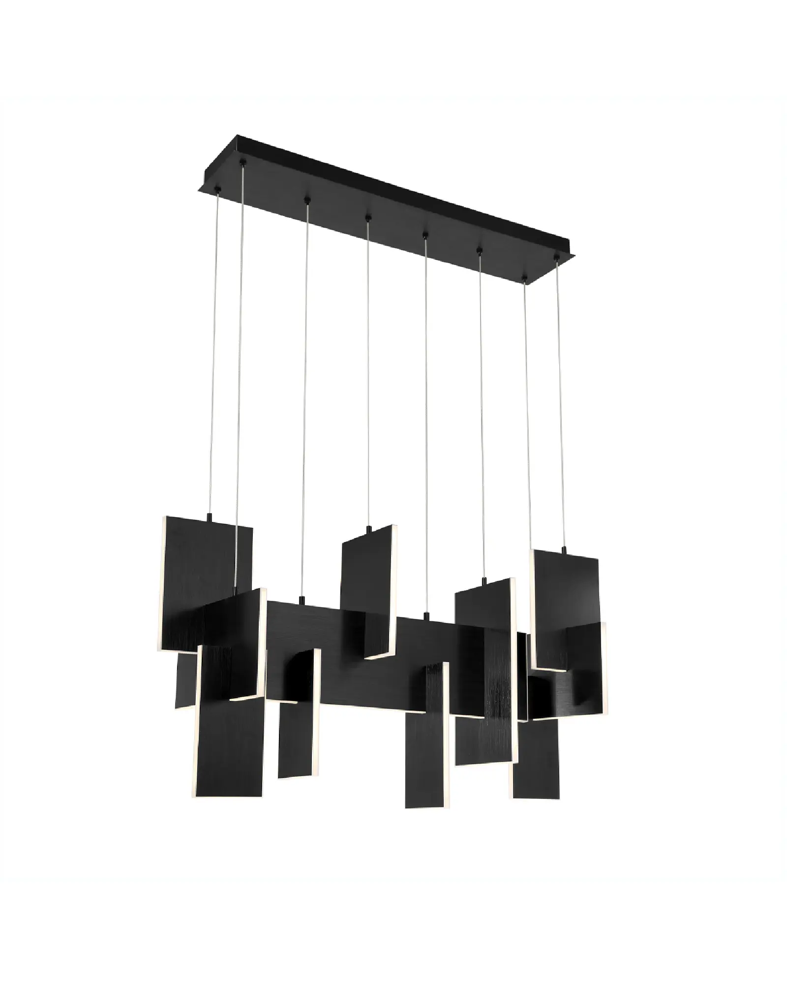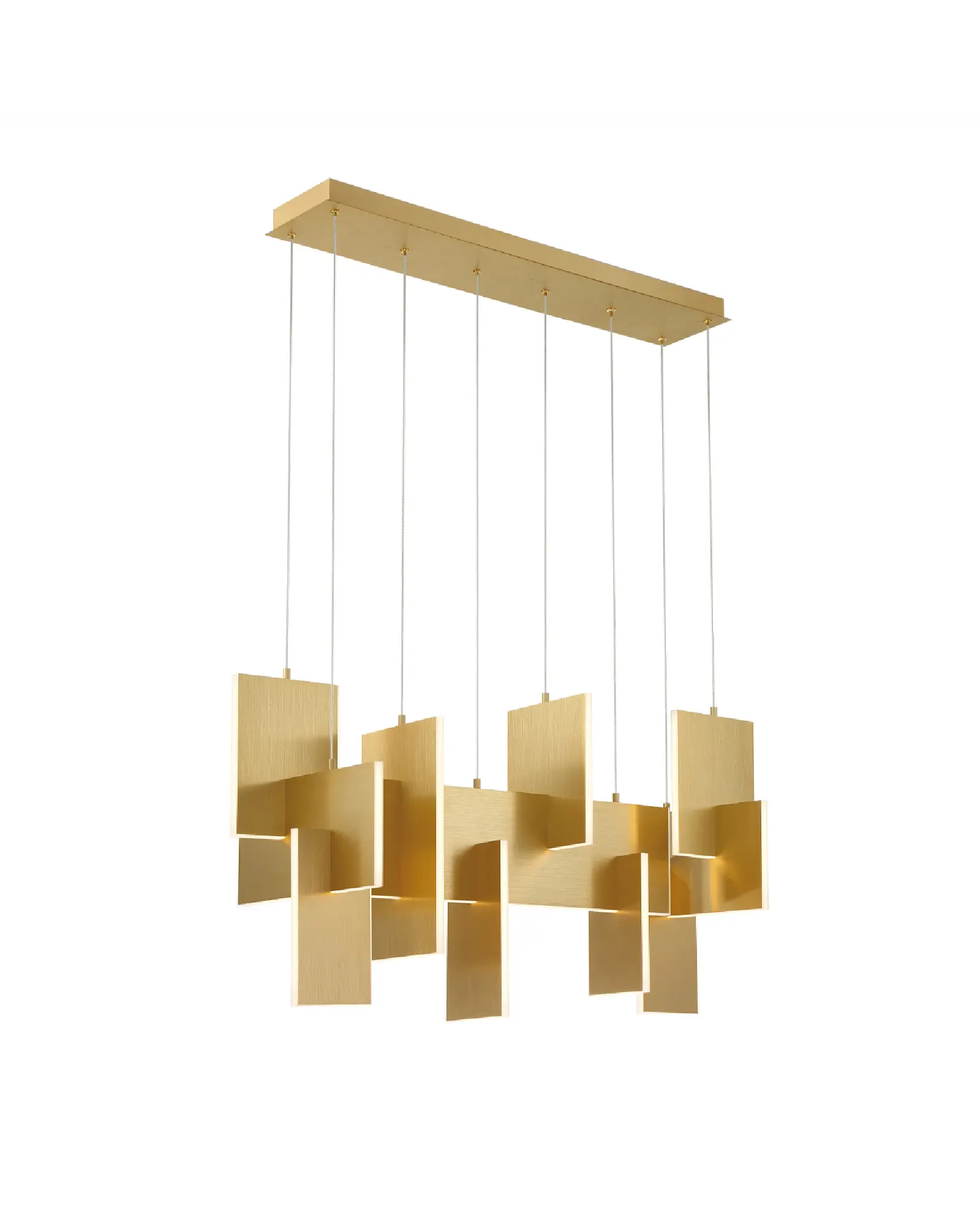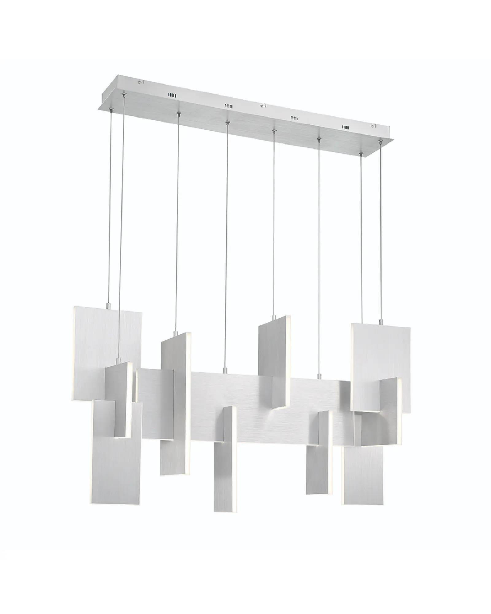 Los paneles LED delgados e iluminados en los bordes se colocan de forma creativa para que se crucen en un diseño dinámico y caprichosamente moderno. Un recorrido continuo de luces LED proporciona una iluminación multidireccional sin interrupciones. Los paneles de aluminio entrelazados están cortados con láser para una mayor precisión y anodizados para crear un acabado duradero y resistente a la corrosión, disponible en dorado o negro.