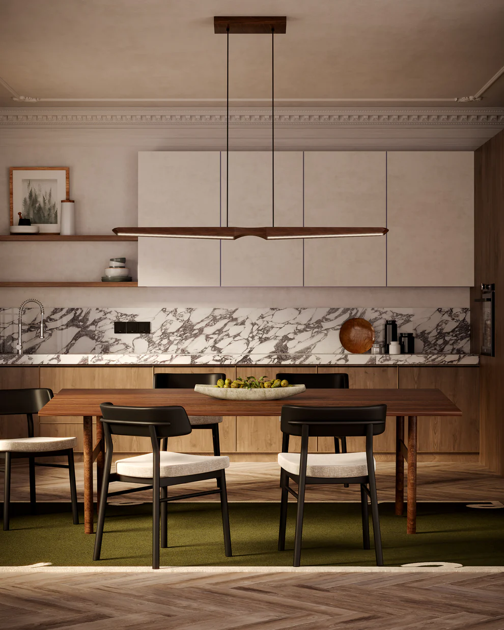 La colección Dakota presenta un diseño lineal de lámparas colgantes elaboradas con madera tallada auténtica, disponibles en tonos nogal intenso o haya clara. Ideales para comedores o islas de cocina.