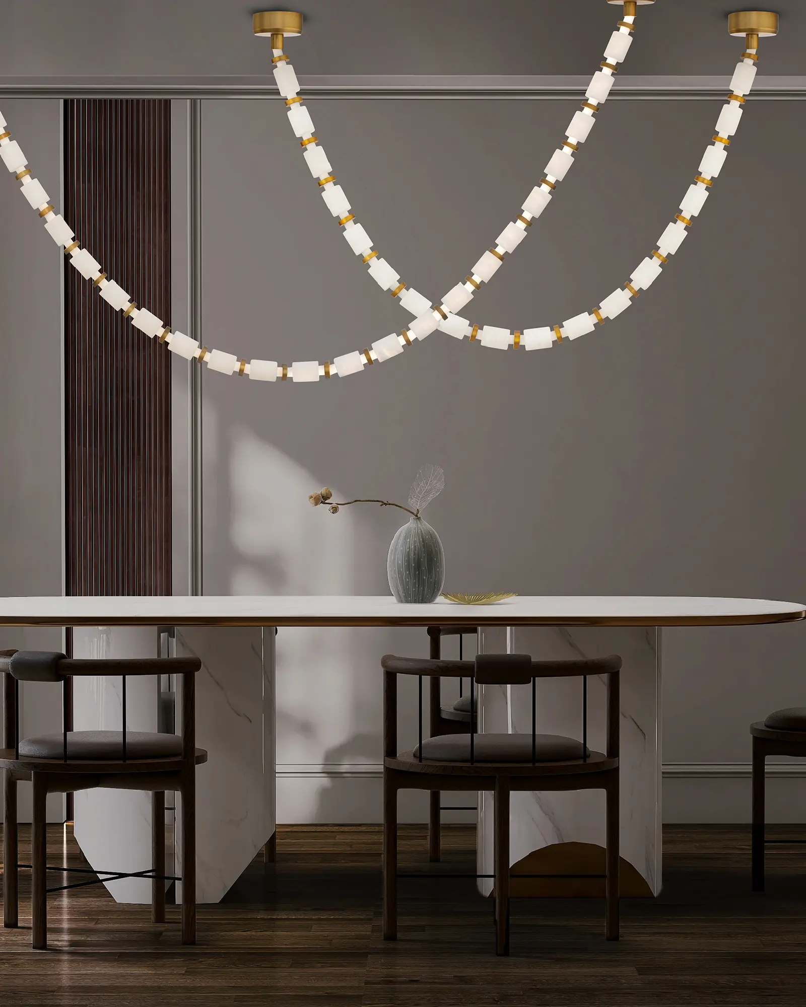 Atemporal y de buen gusto, la fusión del alabastro, el difusor de sílice y los collares de acero crea un conjunto de iluminación elegante y distintivo.