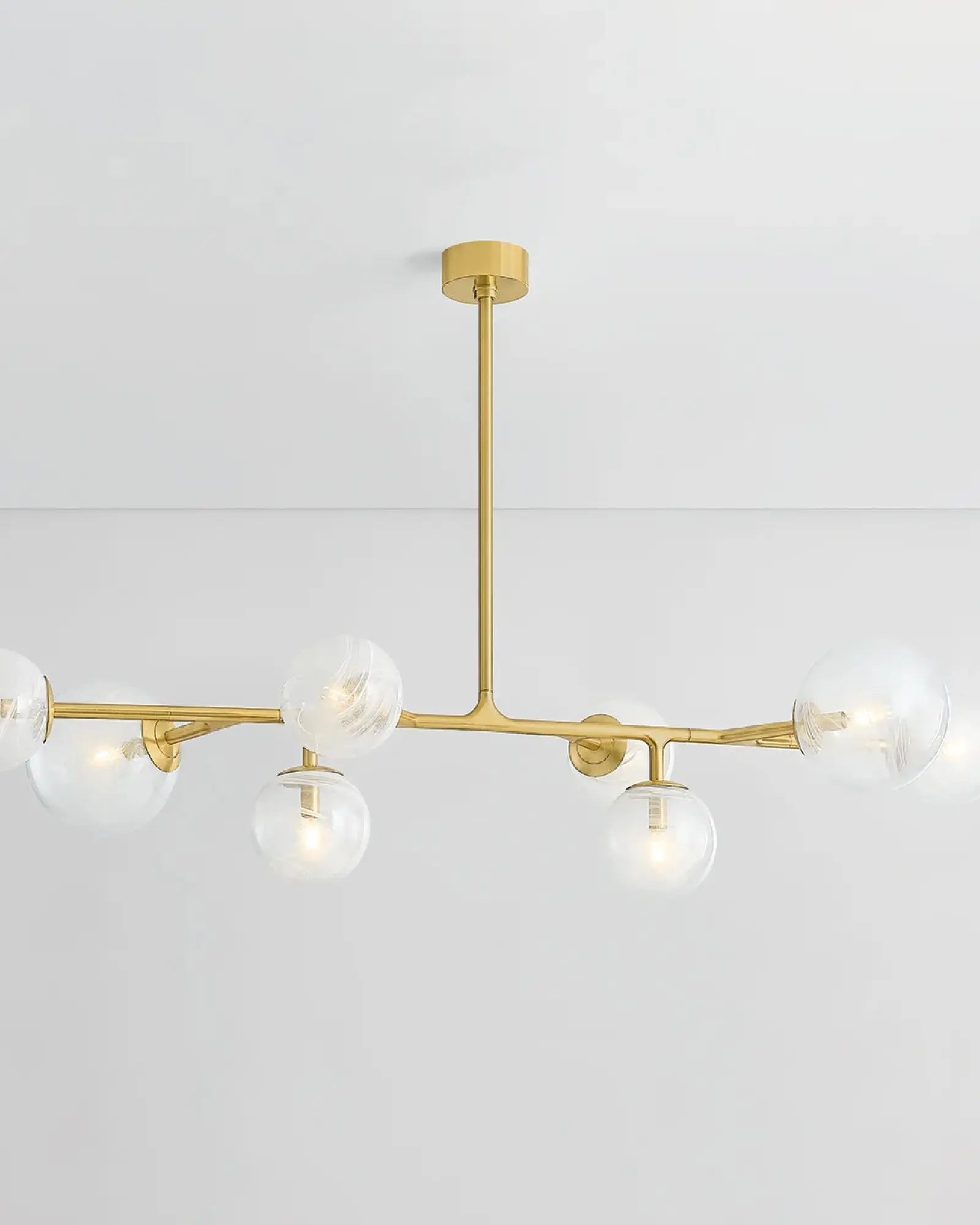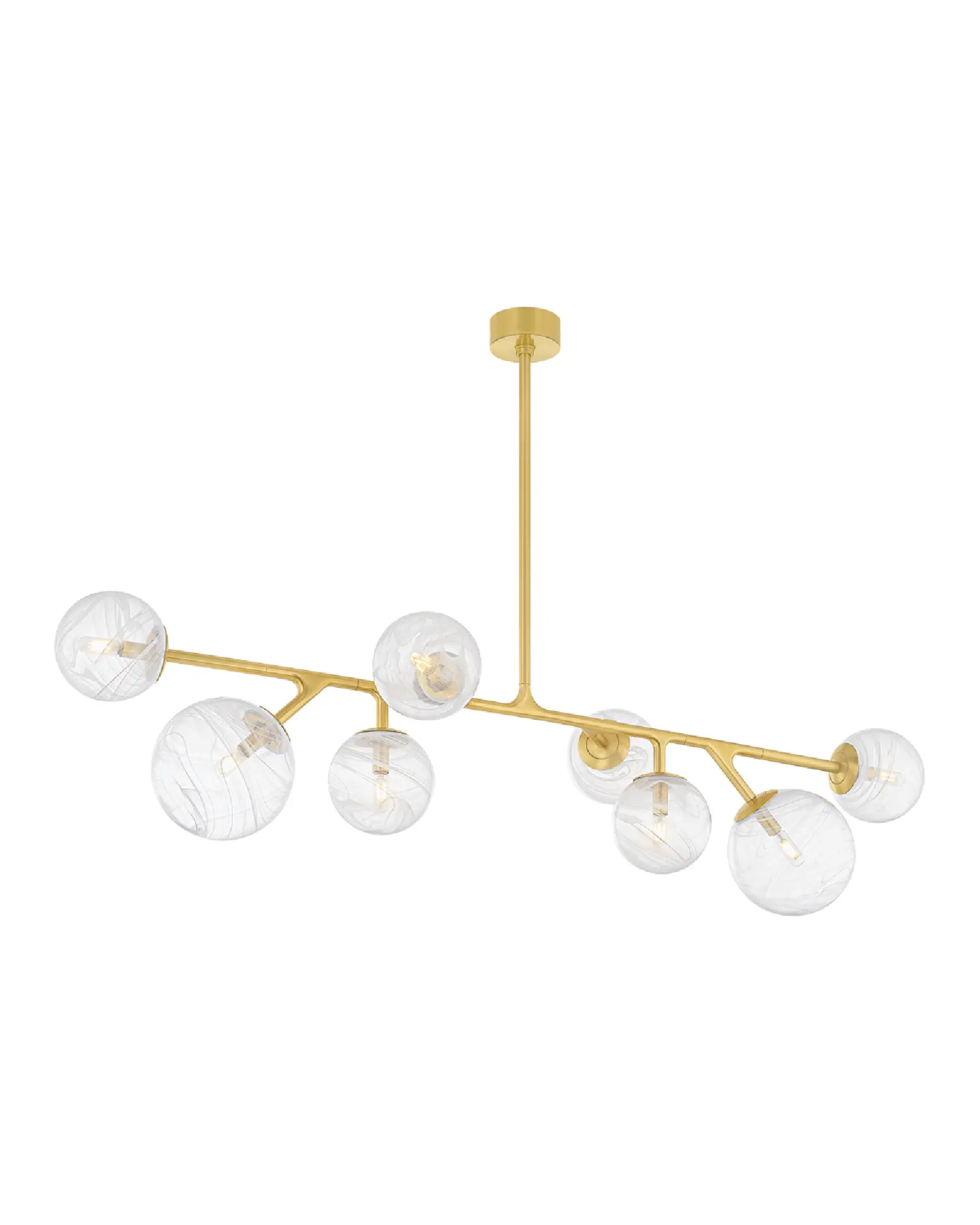 La familia de lámparas de araña y lineales Glasgow captura la vitalidad de la ciudad escocesa que le da nombre. Asemejándose a los cuerpos celestes del cielo nocturno, los globos de cristal Remolino Blanco están suspendidos de un marco de latón pulido vintage inspirado en las ramas. Elija entre diferentes formatos para adaptarse a su espacio, de 8 a 24 luces.