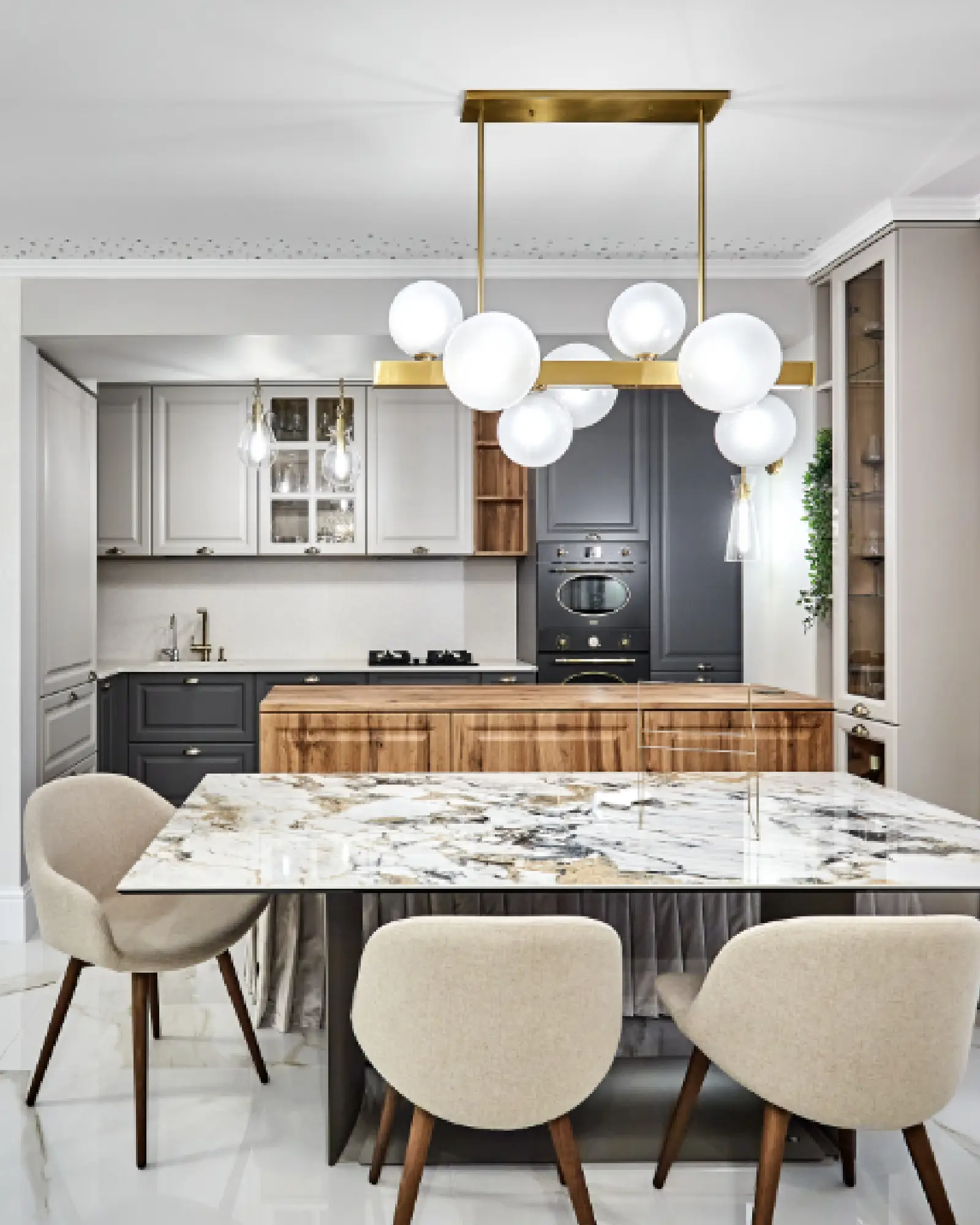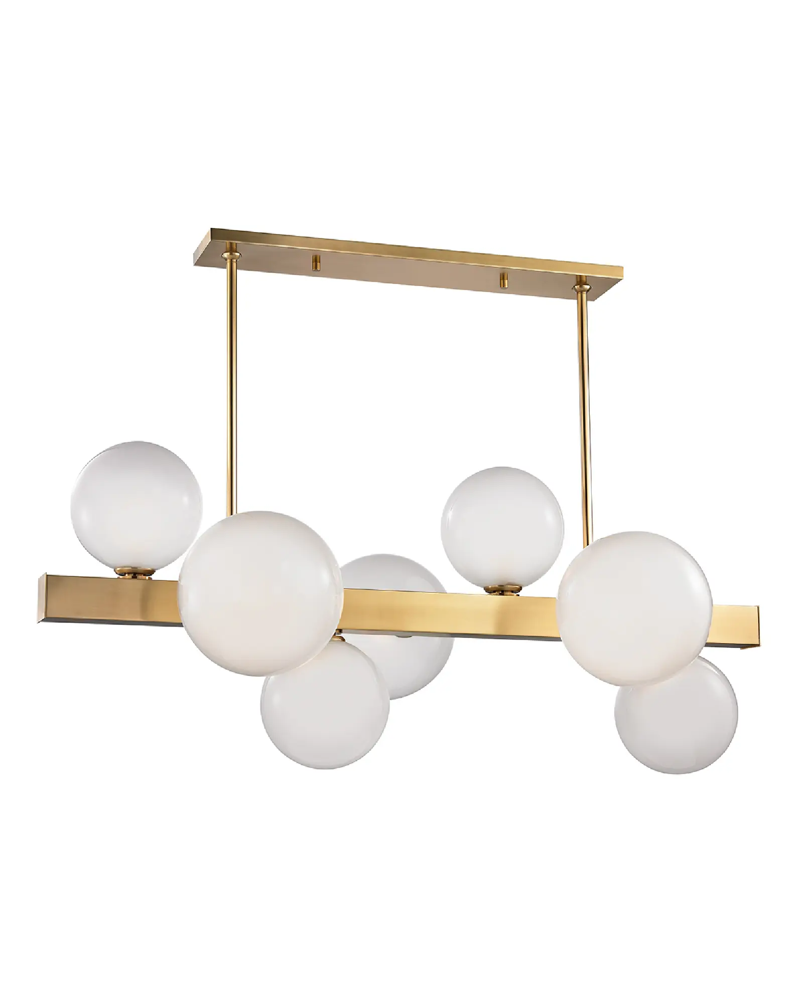 Juguetones y minimalistas, los orbes de luz se agrupan alrededor de una viga metálica cuadrada como si actuara un magnetismo invisible. Las esferas de vidrio soplado a mano están finamente grabadas en el interior, mientras que en el exterior mantienen un brillo transparente. El resultado es una agradable difusión de la luz.