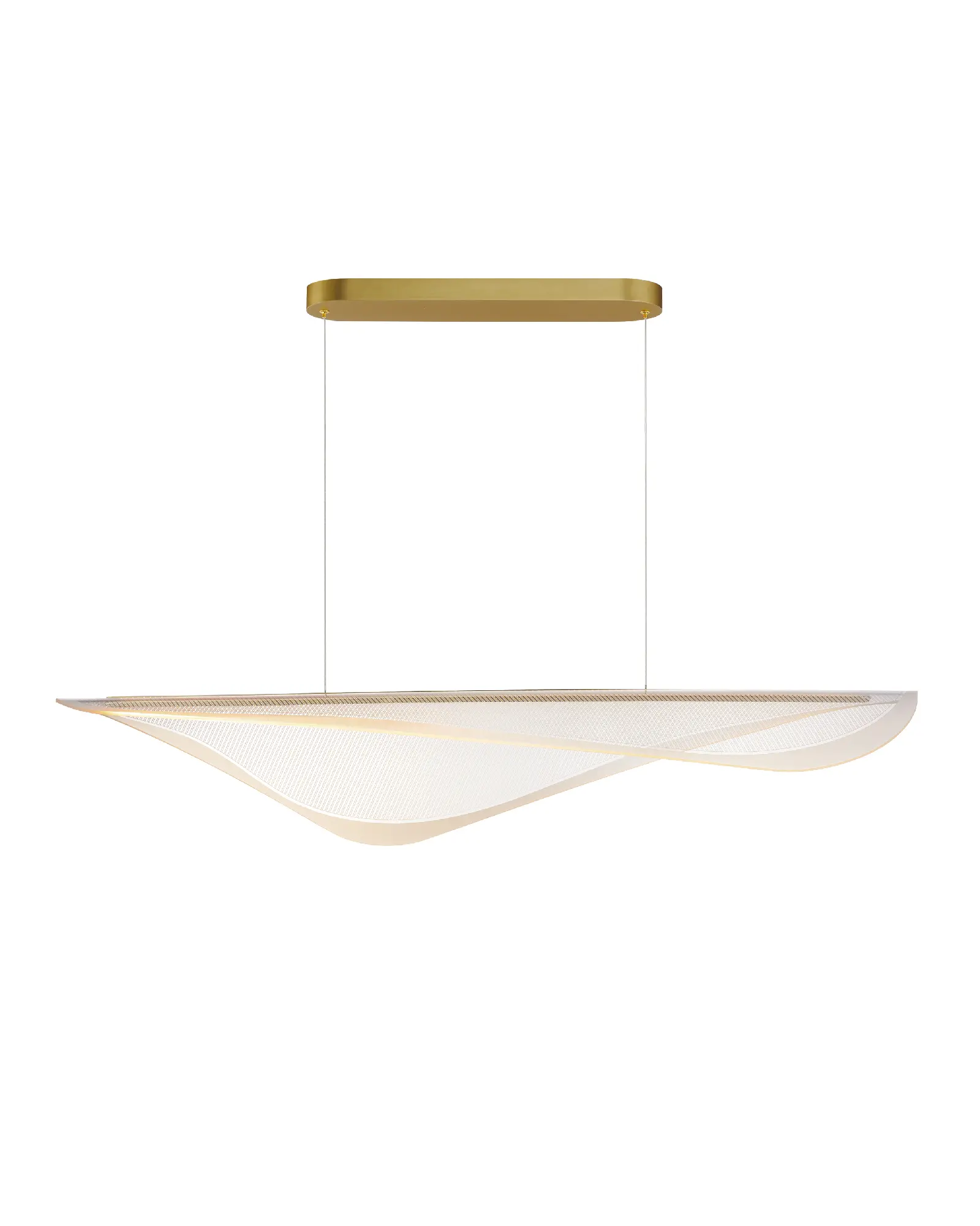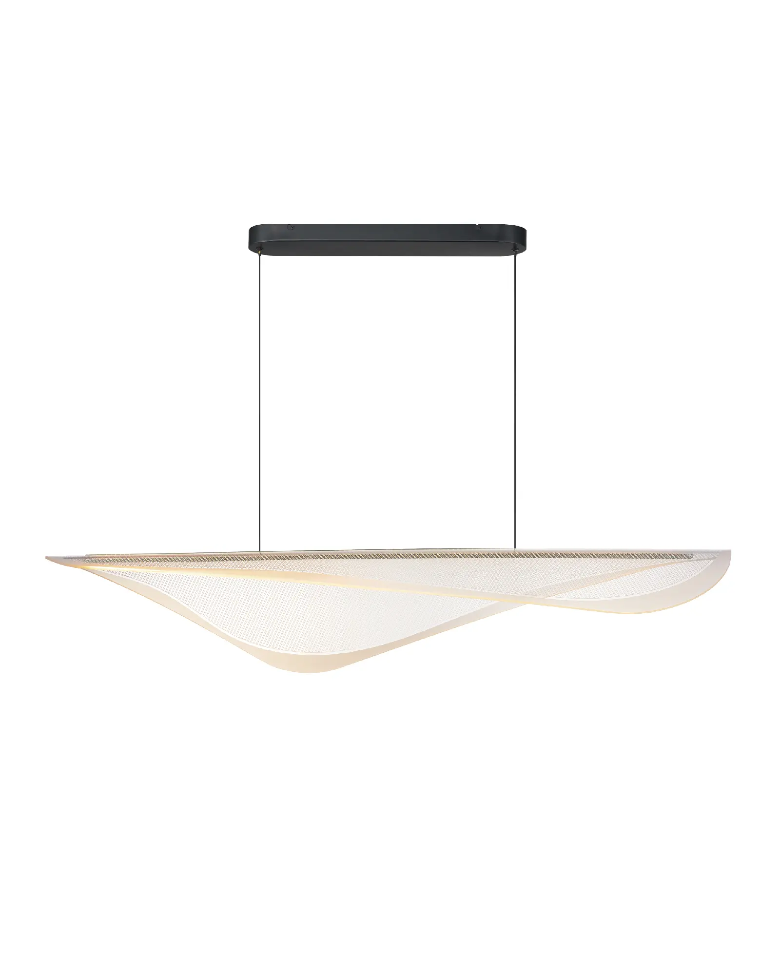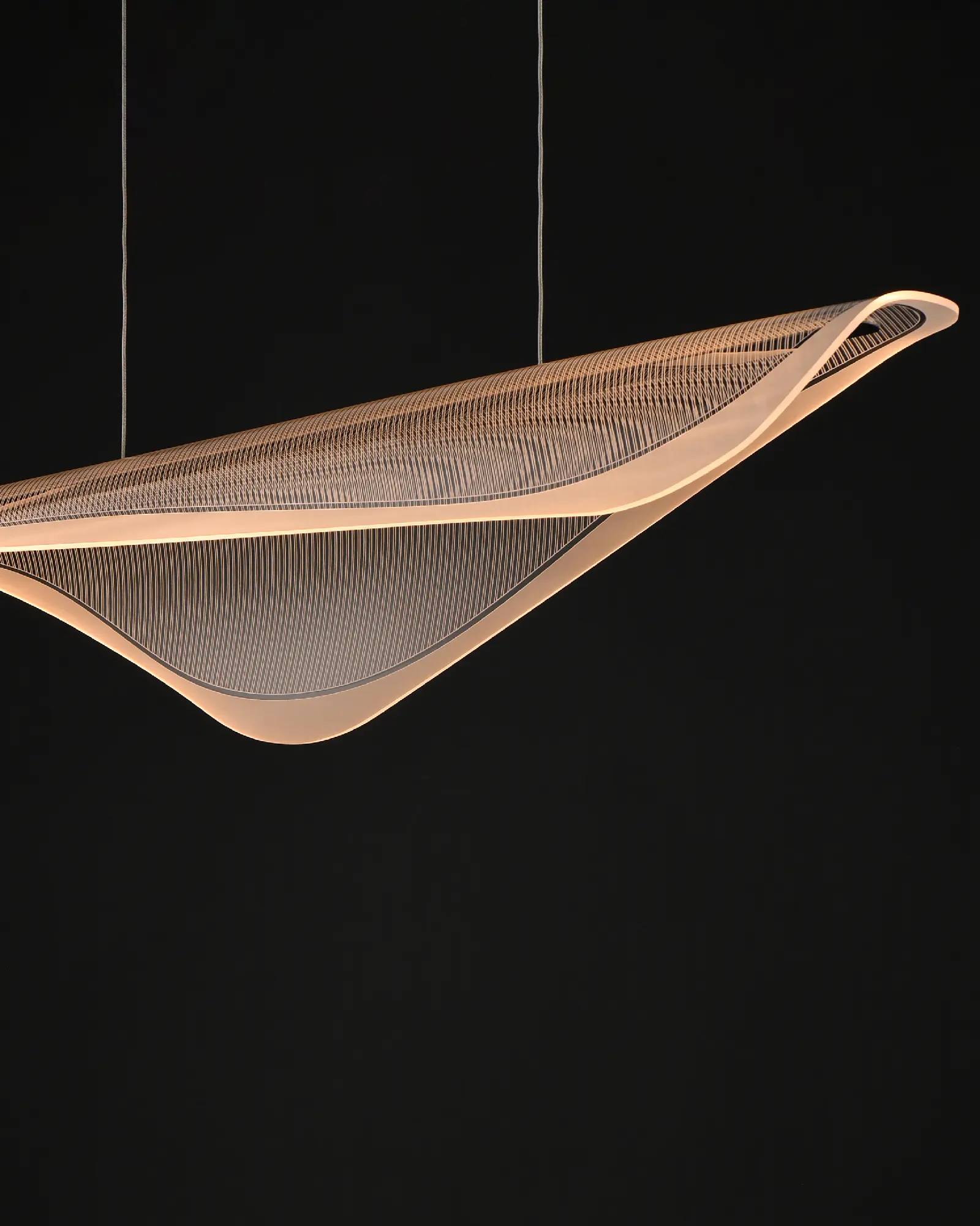Una forma ondulada se curva suavemente a lo largo de su centro para crear una forma orgánica construida a partir de un único panel de acrílico transparente. El efecto cautivador de la banda esmerilada alrededor de los bordes y el grabado estampado en el acrílico que captura la luz realzan aún más la forma.