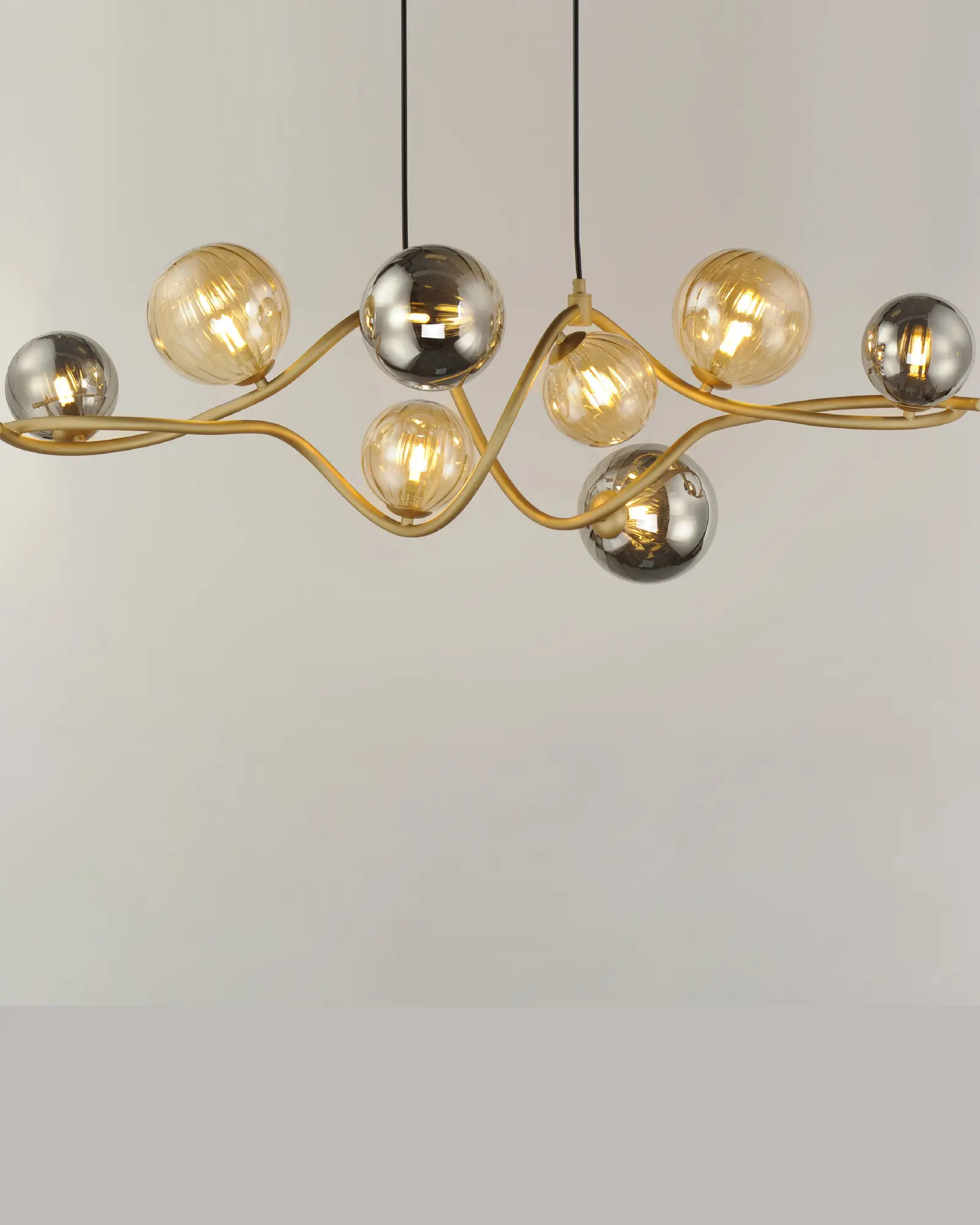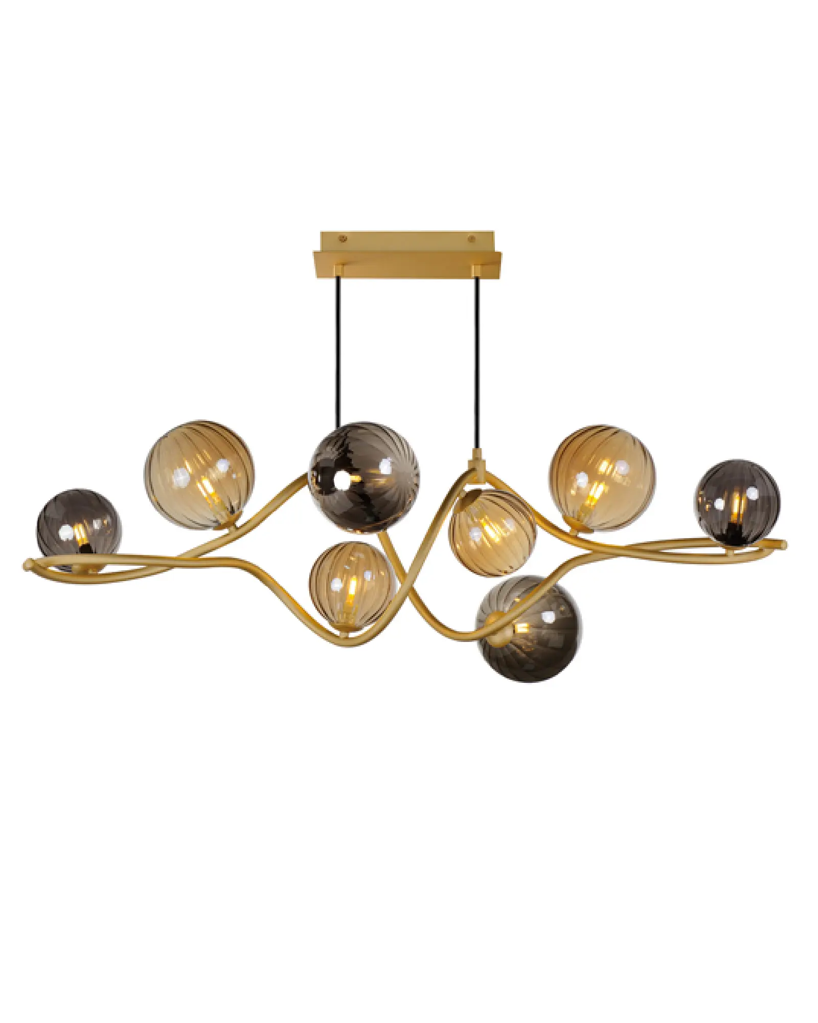 En una galaxia de luz, el cristal estriado y tintado se apoya en arcos de tubos circulares. El marco dorado soporta pantallas de globo de cristal coloreadas en tonos ámbar y ahumado que encierran las lámparas LED suministradas. El colgante único tiene una pantalla de cristal en espiral de gran tamaño en ámbar o ahumado, con una cúpula de luz en su interior y componentes en negro mate. Dos configuraciones de apliques de pared combinan perfectamente con la colección.