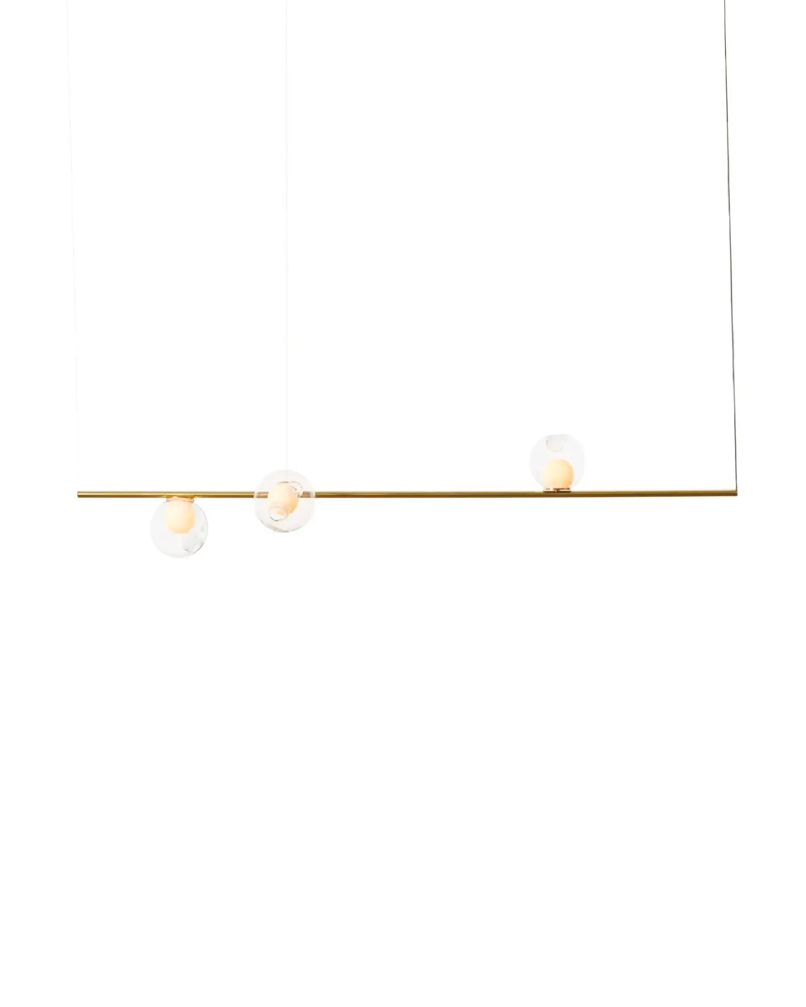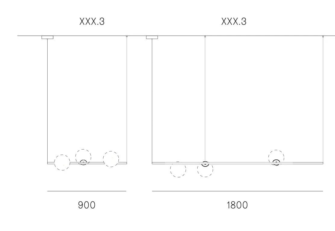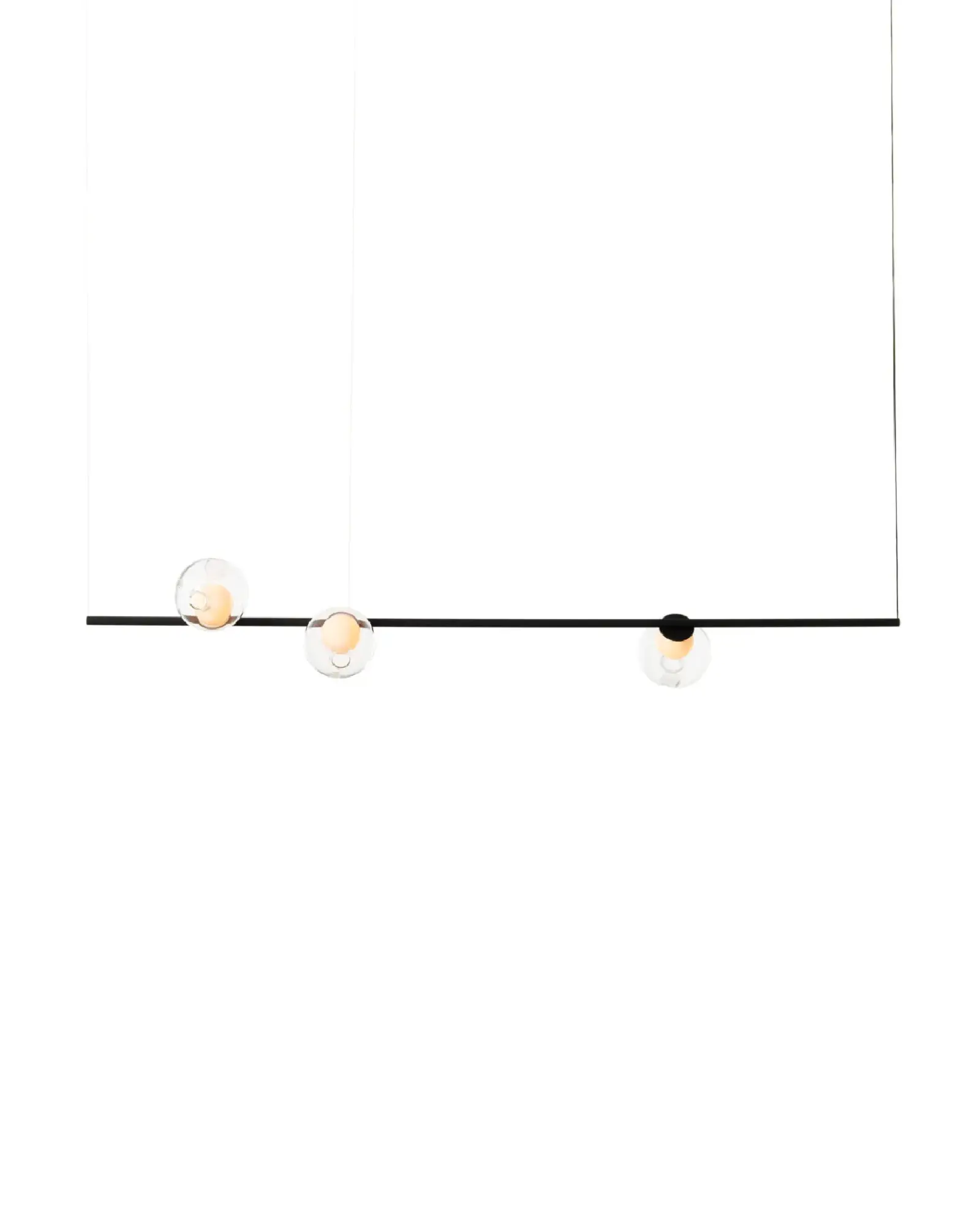 28.3 se compone de tres colgantes de vidrio soplado montados sobre un largo vástago, disponible en acabado lacado en polvo negro o latón. El vástago se une a una única marquesina y se sostiene mediante cables de suspensión.