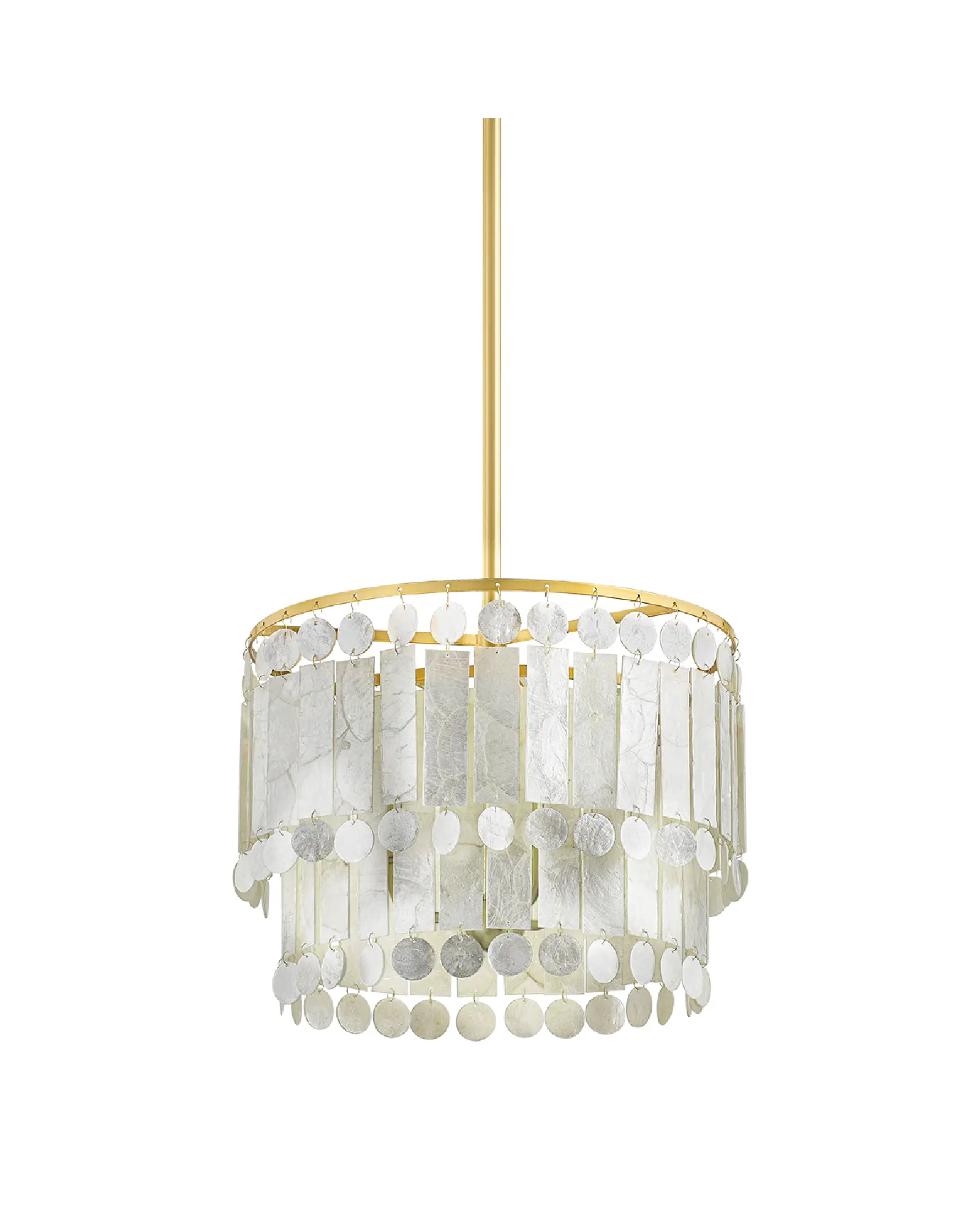Hermosas capas de concha Capiz, en círculos y rectángulos alternados, cuelgan de un marco de latón envejecido para una sofisticada estética costera. Este impresionante diseño, disponible en una lámpara de araña pequeña y grande, es la pieza central perfecta para la actualización de su dormitorio o sala de estar. Forma parte de nuestra colección Megan Molten x Mitzi Tastemakers.