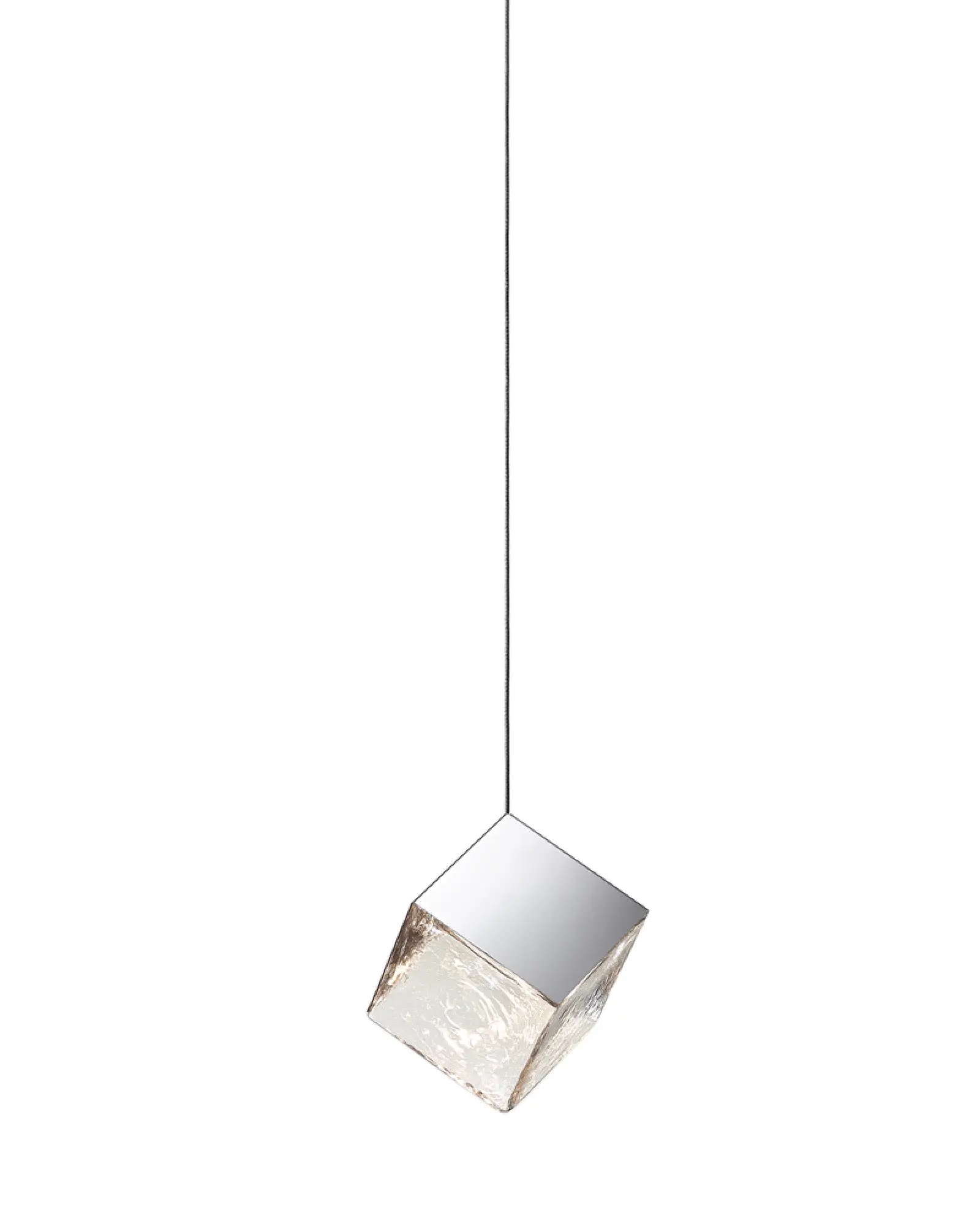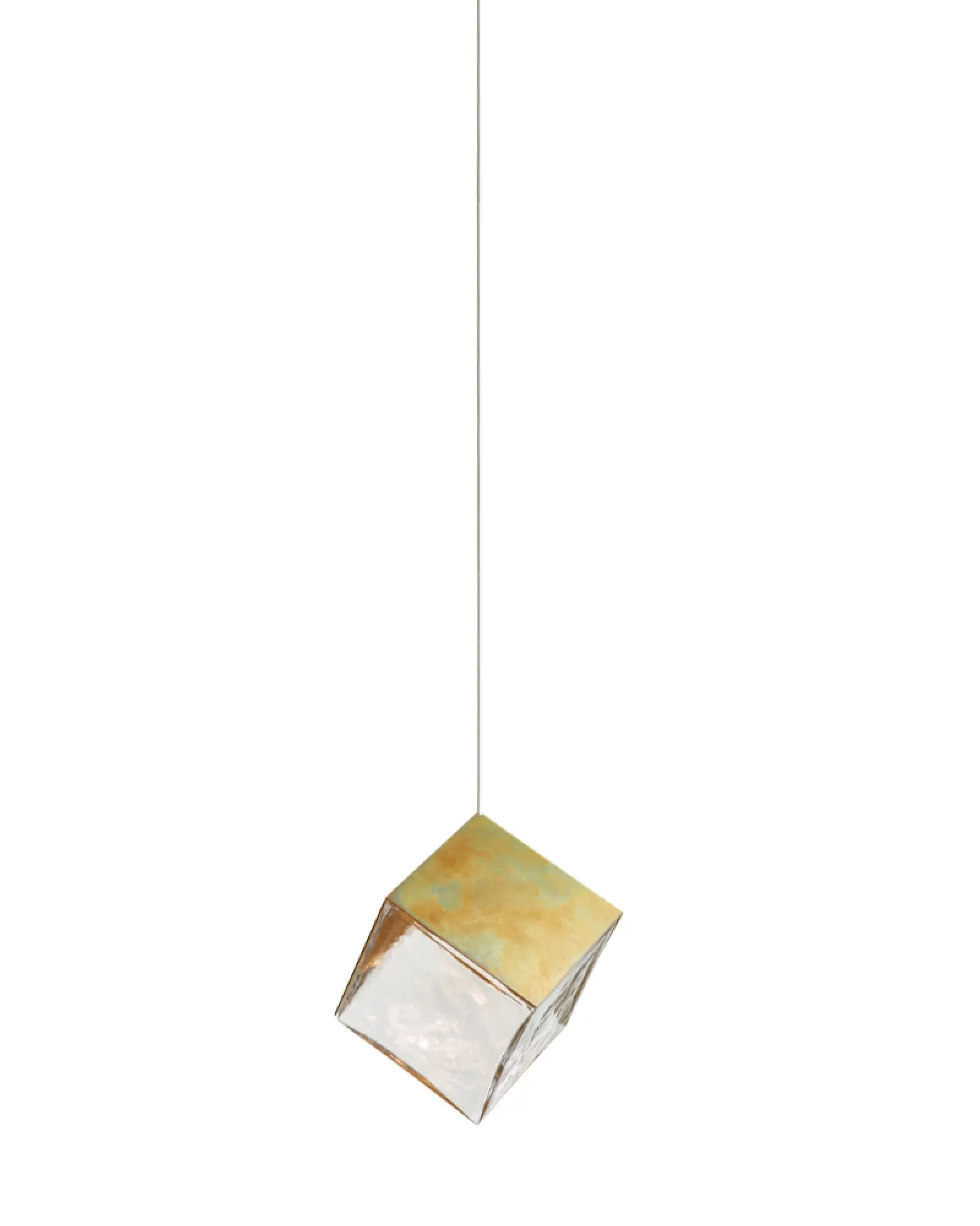 Esta colección se inspira en la pirita, la piedra de fuego dorada con forma de cubo perfecto, mientras que la versión plateada de la pantalla refleja su inspiración en los cristales de sal. La superficie de este cubo de cristal soplado a mano está encerrada por tres lados en un elemento de latón DeOpale. Este exquisito herraje de latón adquiere efectos cromáticos particulares, gracias a la oxidación manual del latón, como los juegos de luces del ópalo de fuego caracterizado por un fondo amarillo con reflejos que pueden ser particularmente vivos y brillantes, cambiando en tonos irisados del rojo al naranja.